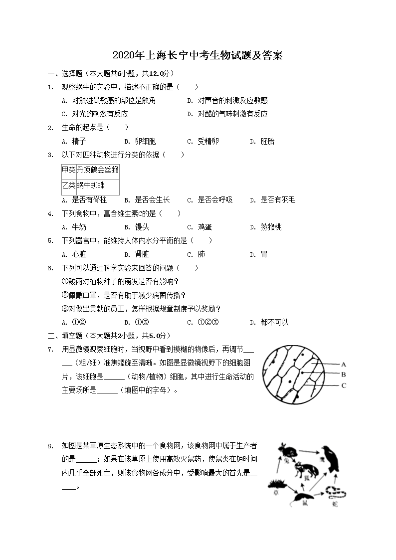 【文档预览】 无忧考网整理发布2020年上海长宁中考生物试题及答案(Word版),前五页预览如下: