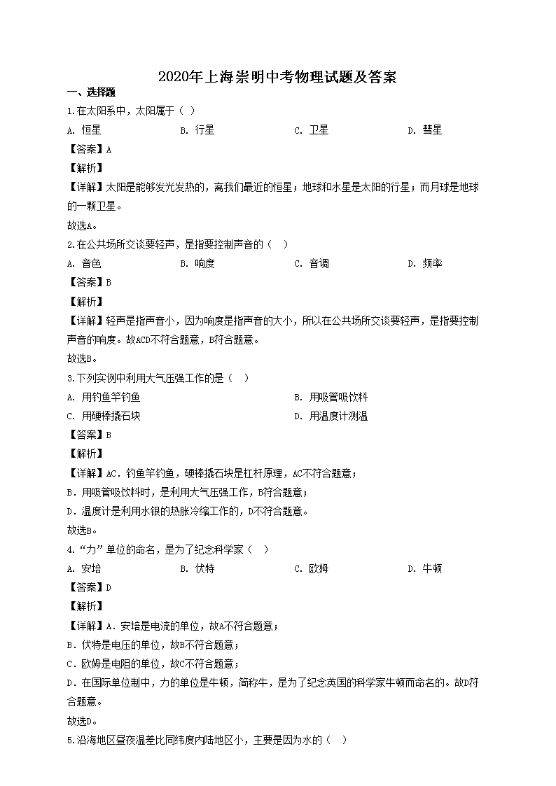 【文档名称】 2020年上海崇明中考物理试题及答案(Word版).doc