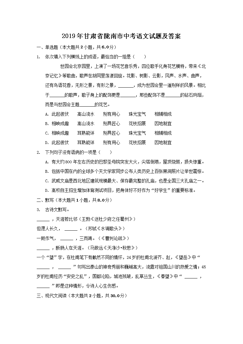 【文档名称】 2019年甘肃省陇南市中考语文试题及答案(Word版).doc
