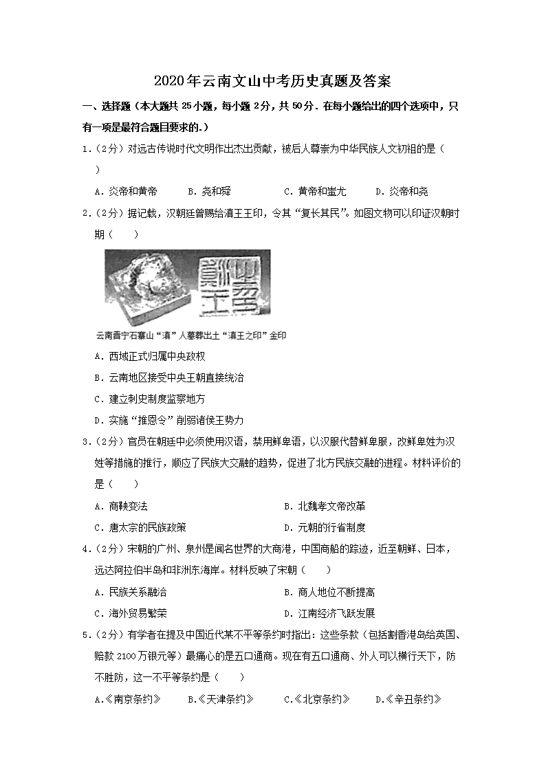 【文档名称】 2020年云南文山中考历史真题及答案(Word版).doc