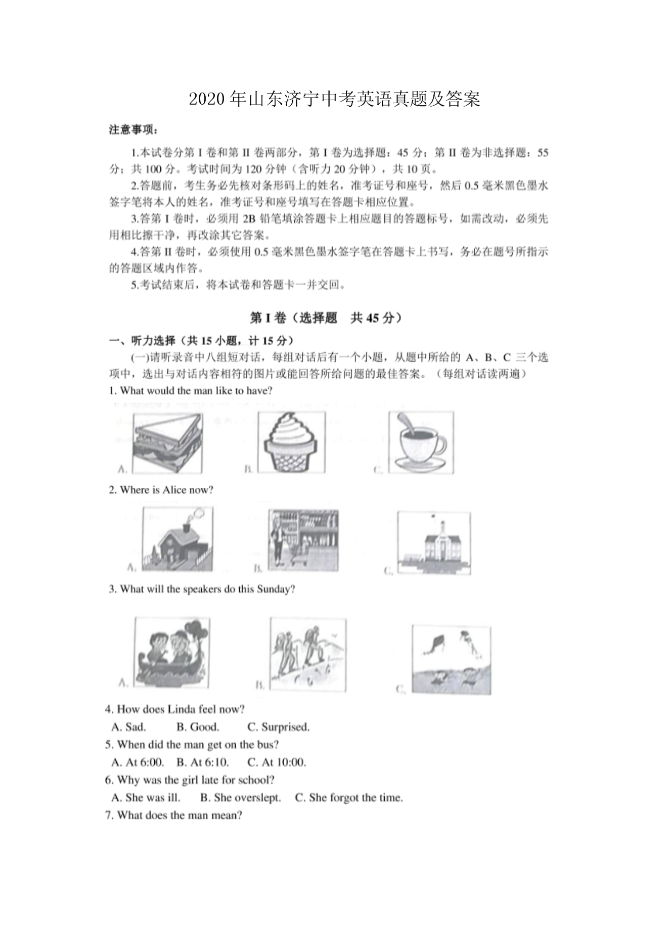 【文档名称】 2020年山东济宁中考英语真题及答案(图片版).doc
