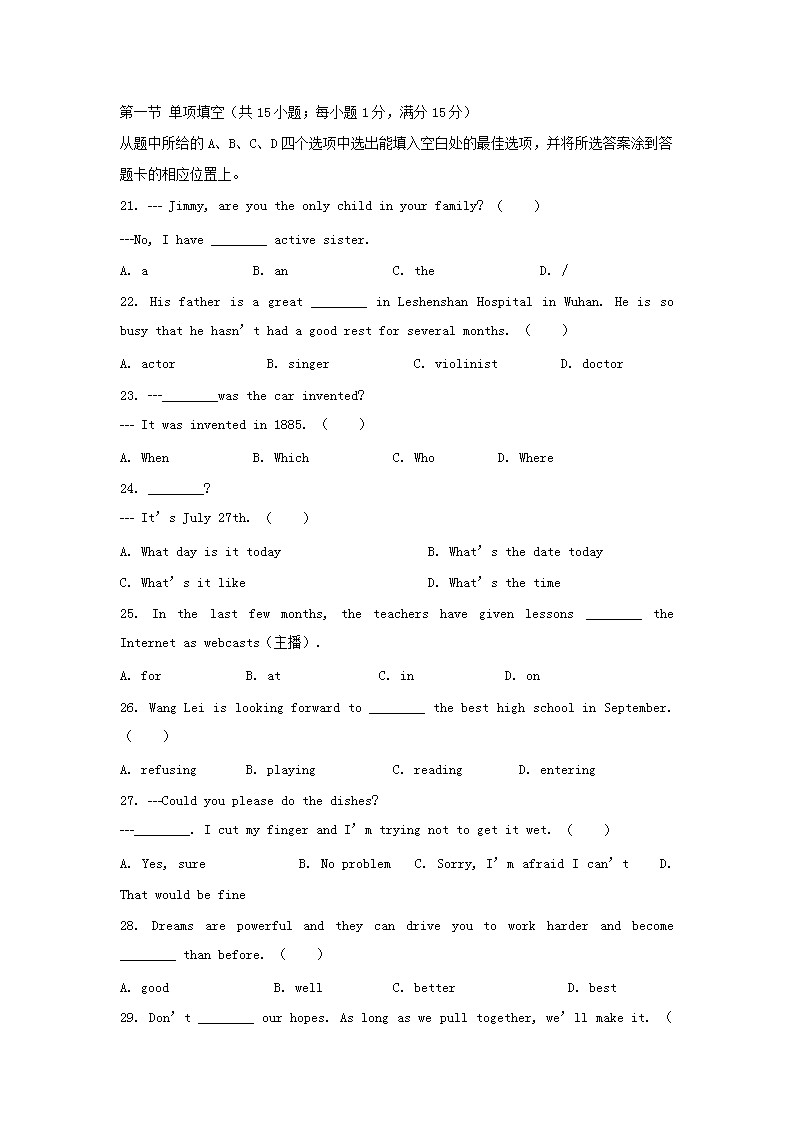 【文档预览】 无忧考网整理发布2020年云南临沧中考英语真题及答案(Word版),前五页预览如下: