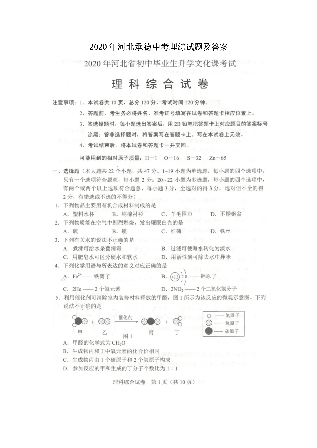【文档名称】 2020年河北承德中考理综试题及答案(图片版).doc
