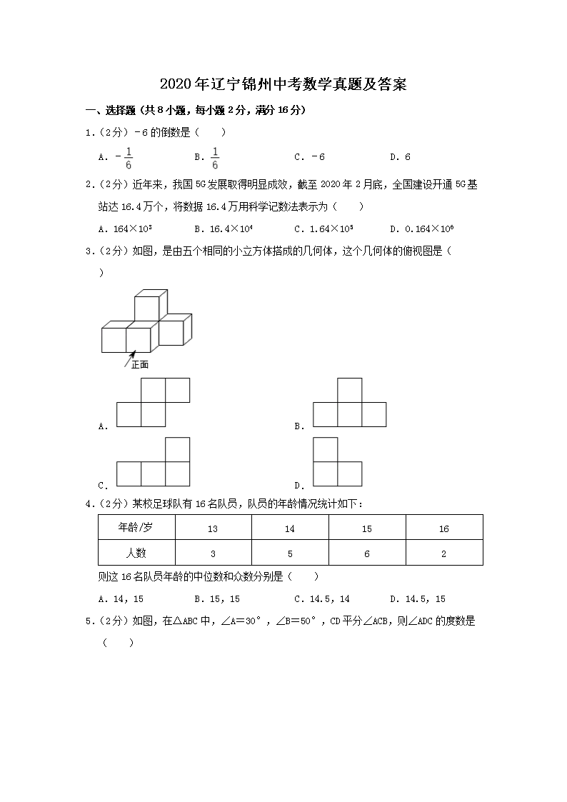 【文档名称】 2020年辽宁锦州中考数学真题及答案(Word版).doc