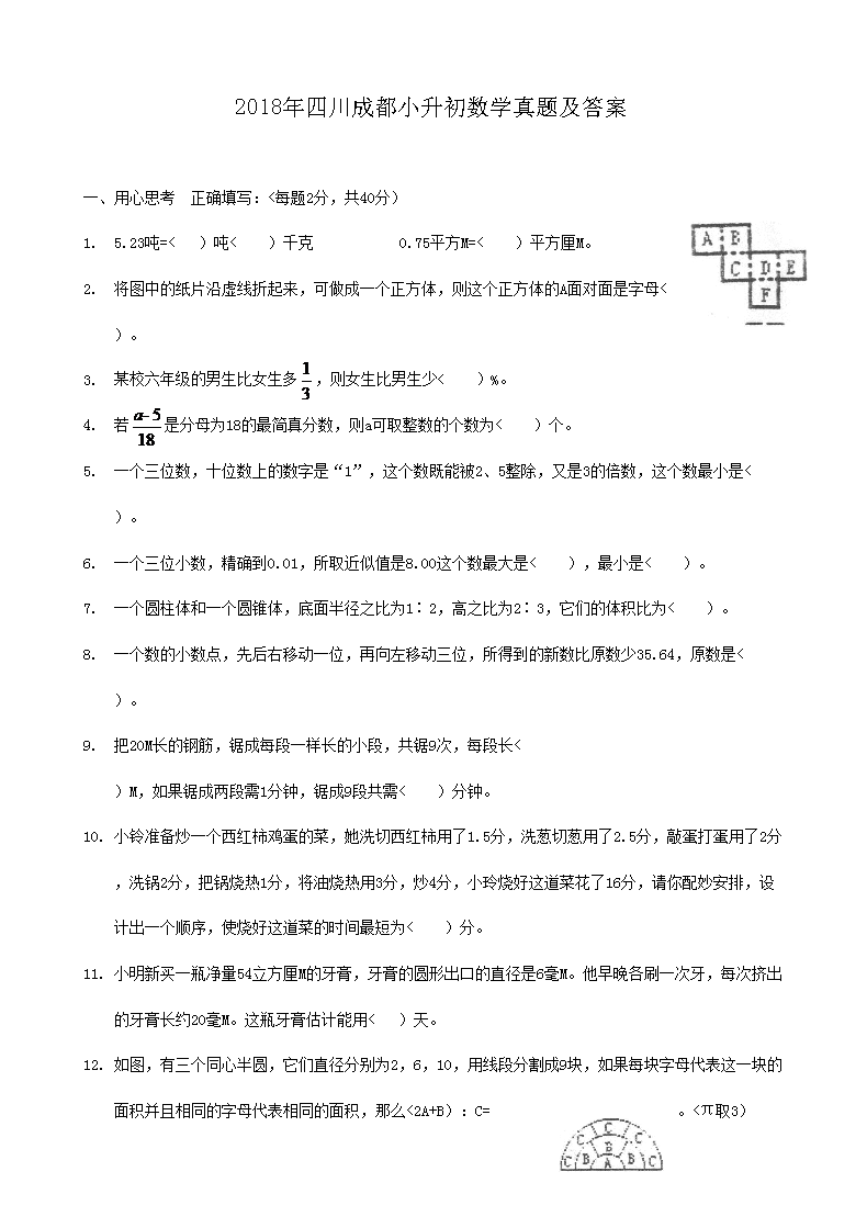 【文档名称】 2018年四川成都小升初数学真题及答案(Word版).doc