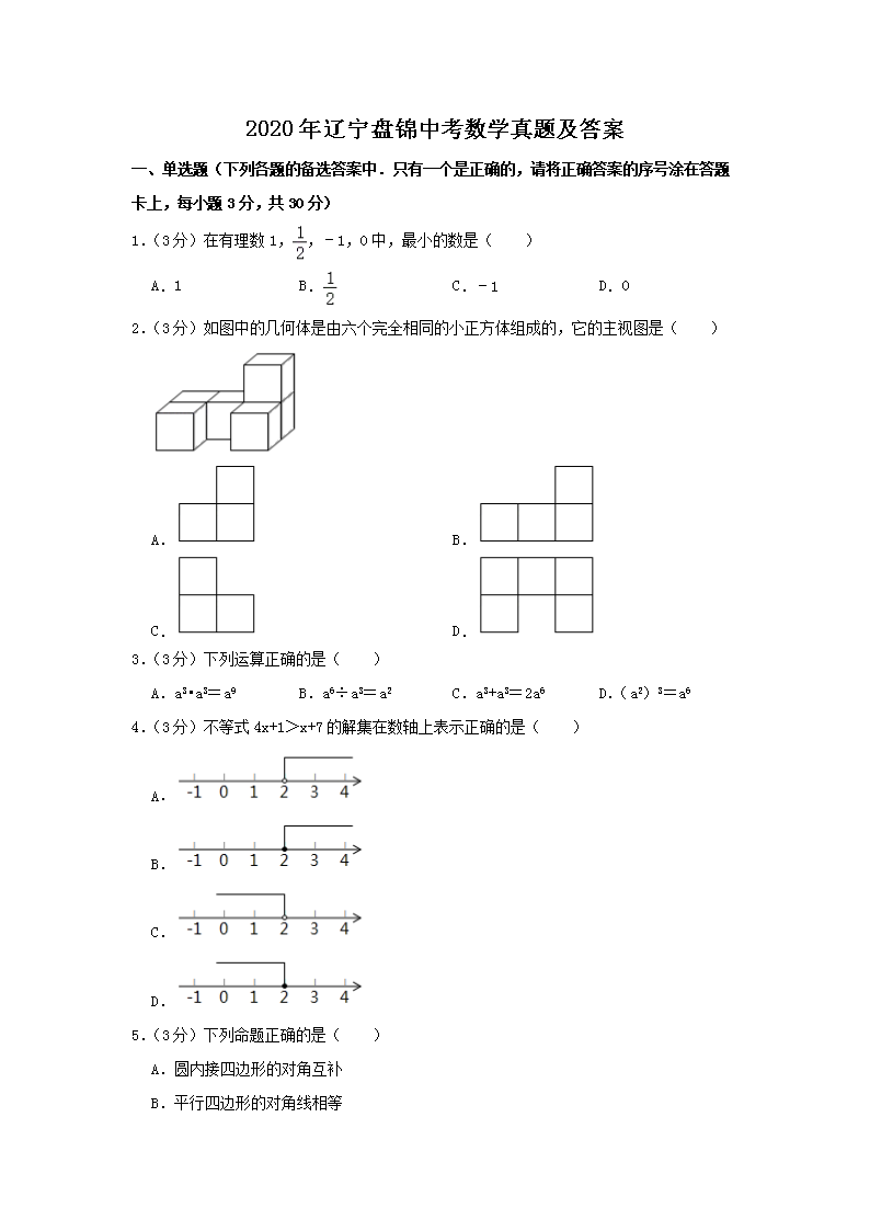 【文档名称】 2020年辽宁盘锦中考数学真题及答案(Word版).doc