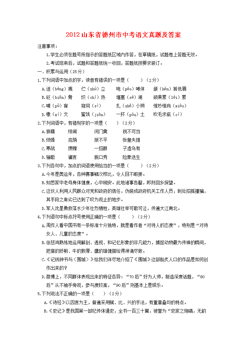 【文档名称】 2012山东省德州市中考语文真题及答案(Word版).doc