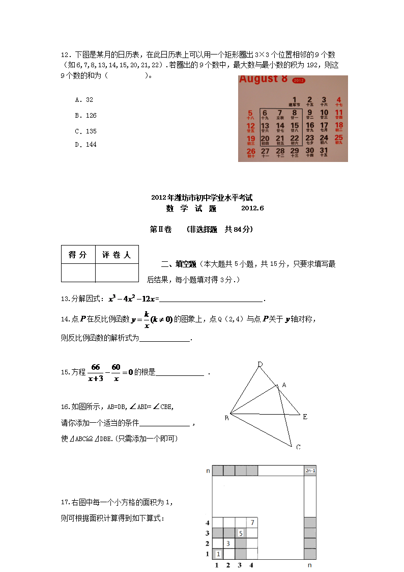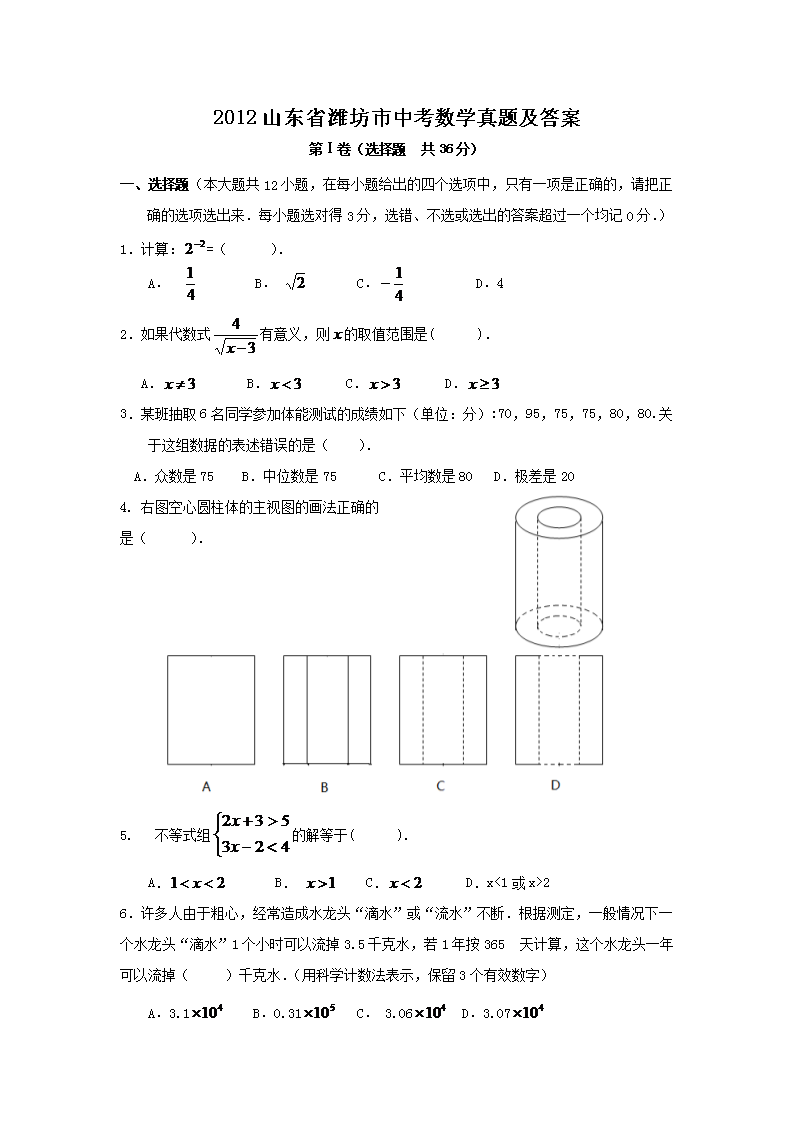 【文档名称】 2012山东省潍坊市中考数学真题及答案(Word版).doc