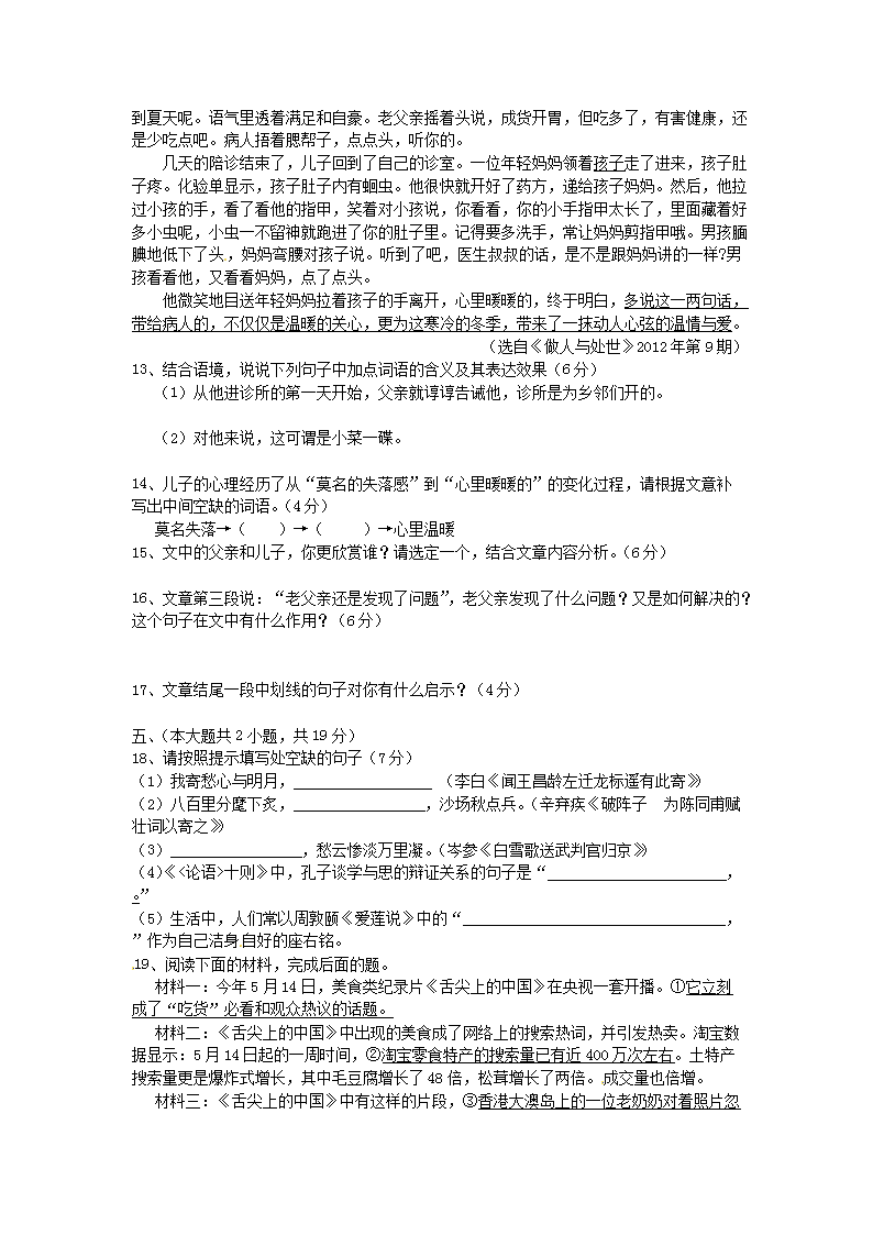 【文档名称】 2012新疆乌鲁木齐中考语文真题及答案(Word版).doc