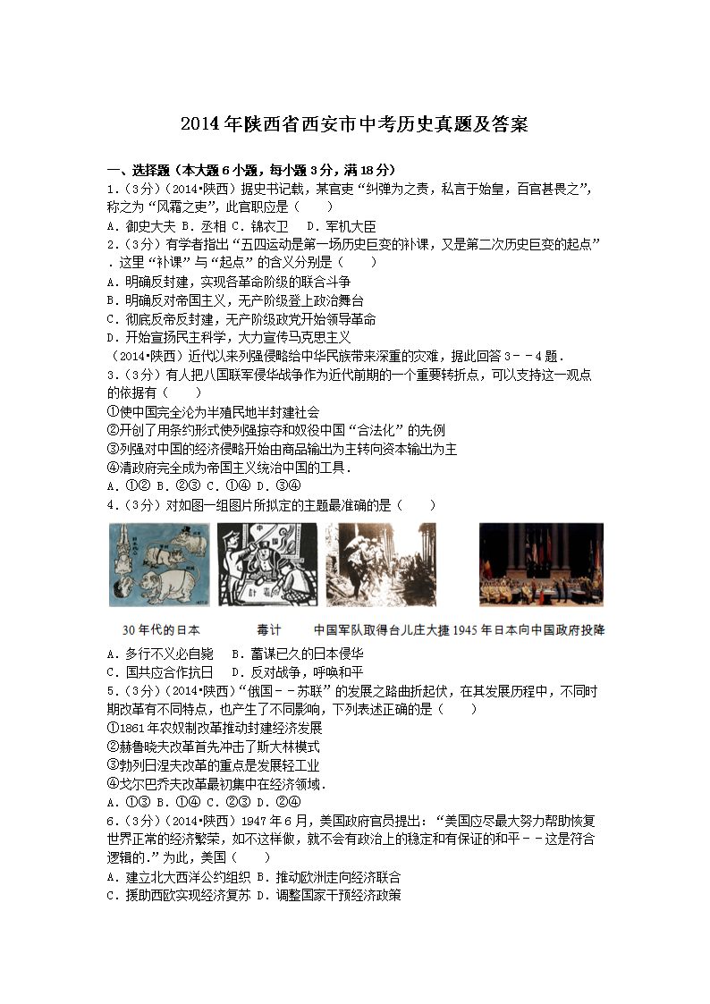 【文档名称】 2014年陕西省西安市中考历史真题及答案(Word版).doc