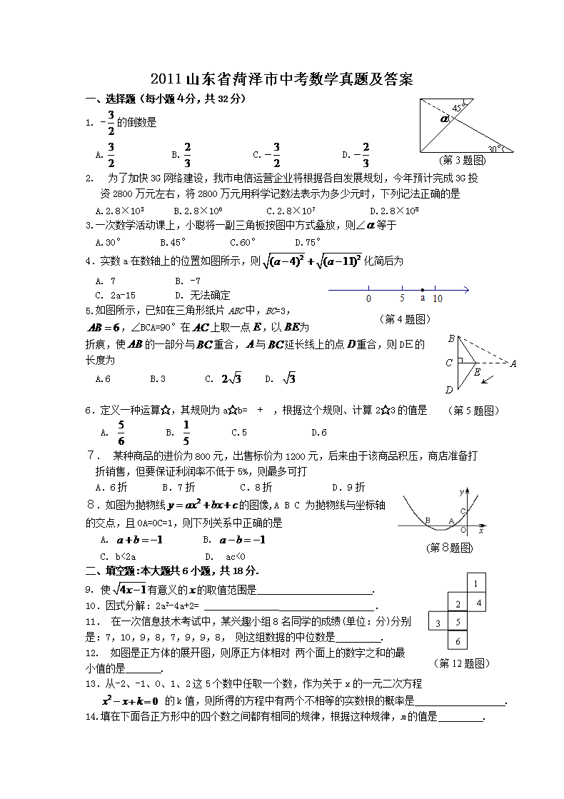 【文档名称】 2011山东省菏泽市中考数学真题及答案(Word版).doc