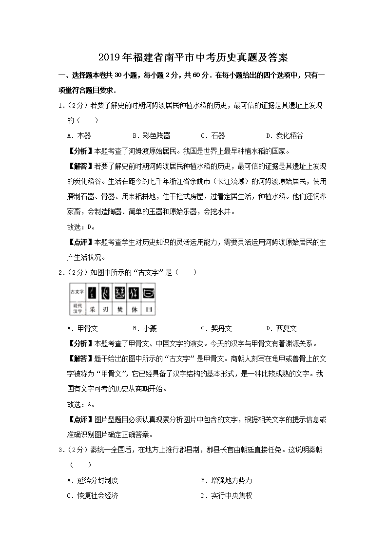 【文档名称】 2019年福建省南平市中考历史真题及答案(Word版).doc