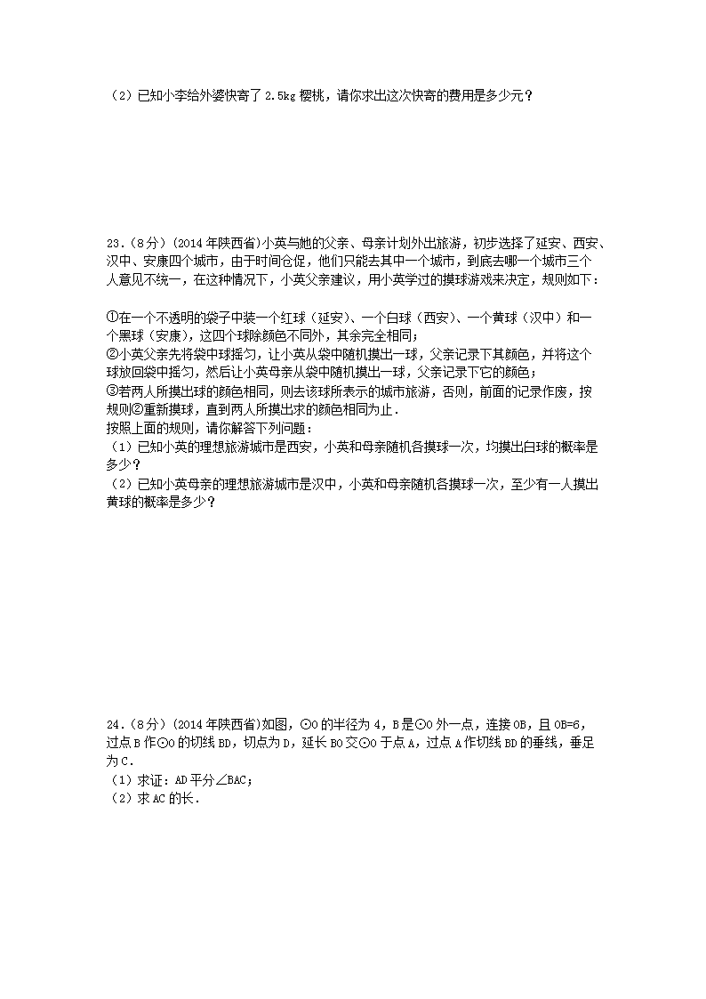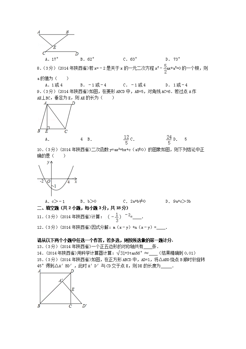 【文档名称】 2014年陕西省汉中市中考数学真题及答案(Word版).doc