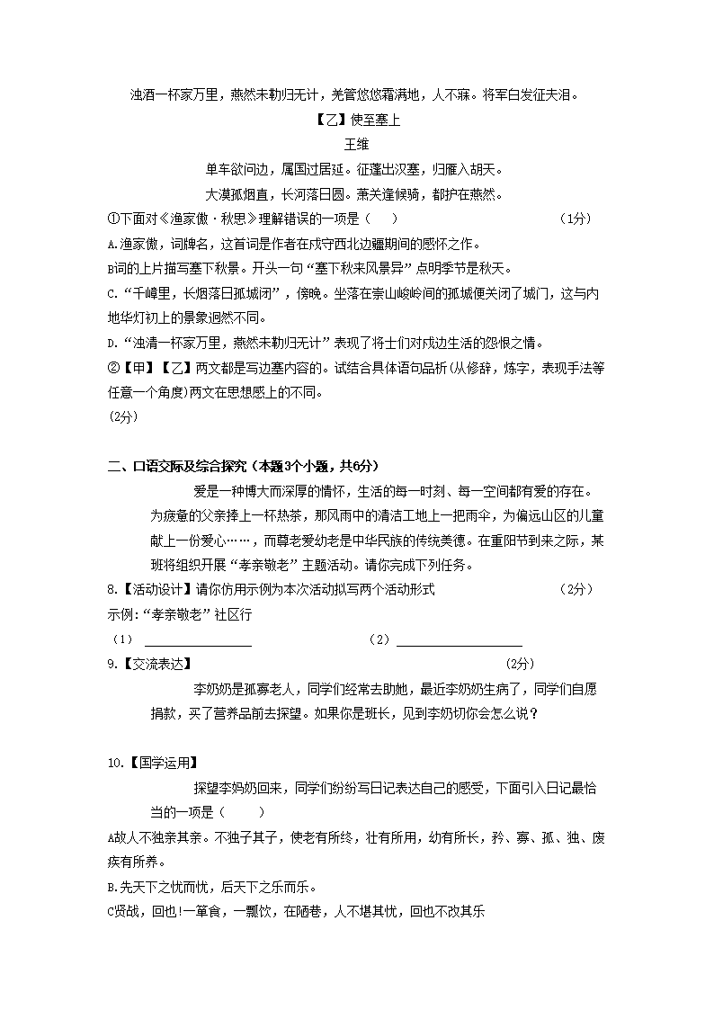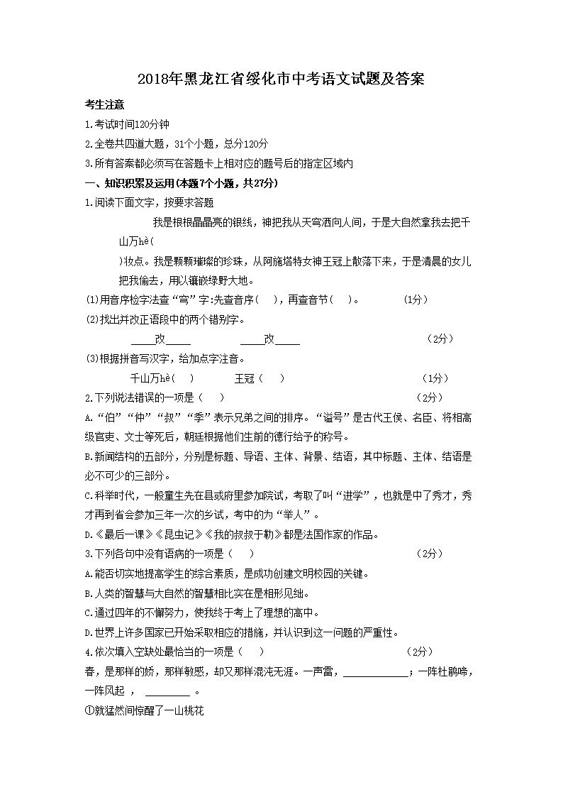 【文档名称】 2018年黑龙江省绥化市中考语文试题及答案(Word版).doc