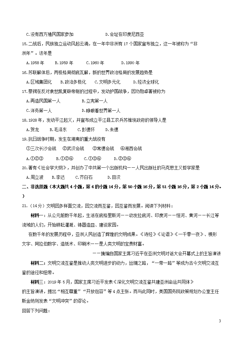 【文档名称】 2019年湖南省岳阳市中考历史真题及答案(Word版).doc
