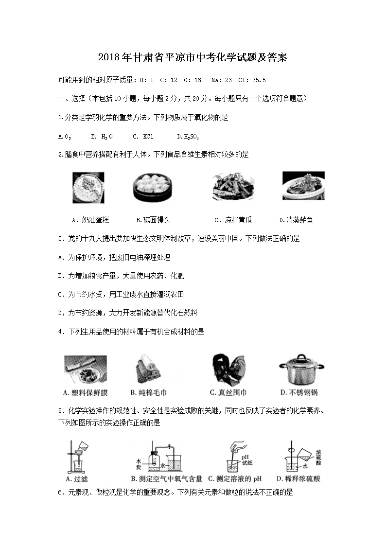 【文档名称】 2018年甘肃省平凉市中考化学试题及答案(Word版).doc