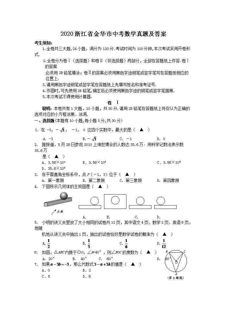 【文档名称】 2020浙江省金华市中考数学真题及答案(Word版).doc