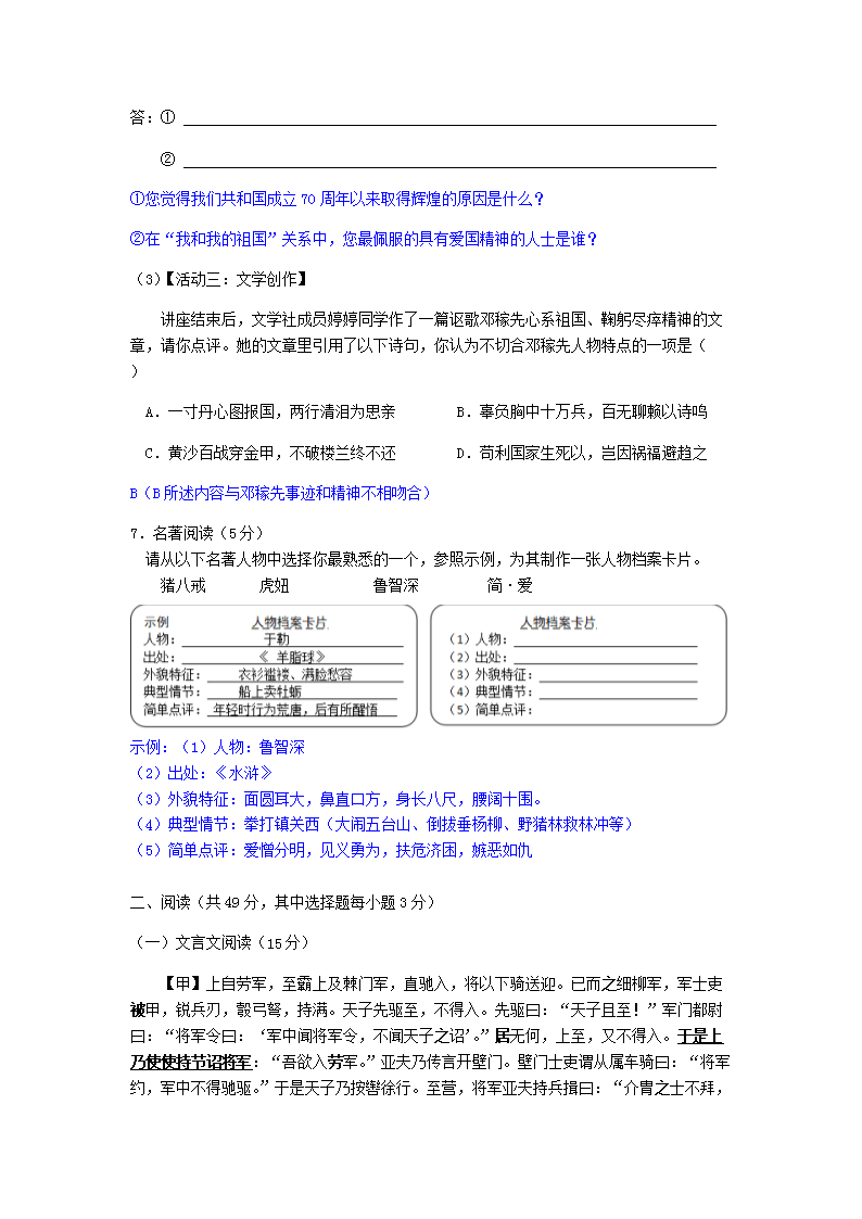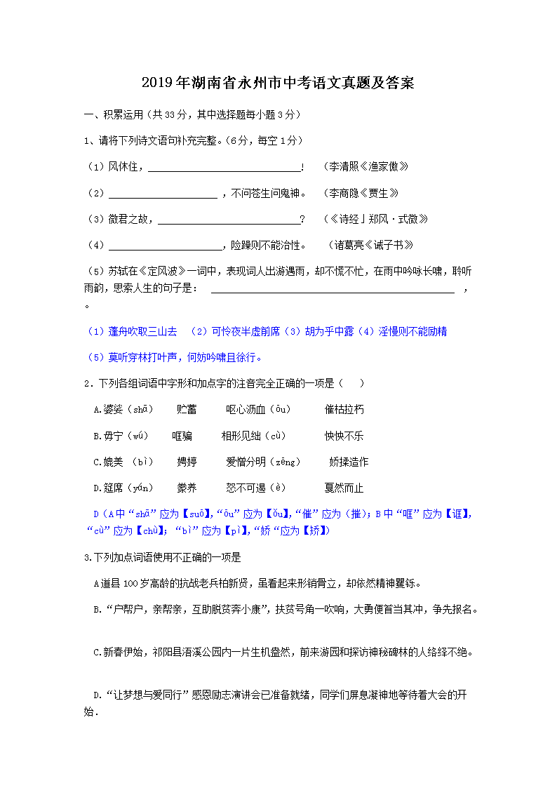【文档名称】 2019年湖南省永州市中考语文真题及答案(Word版).doc