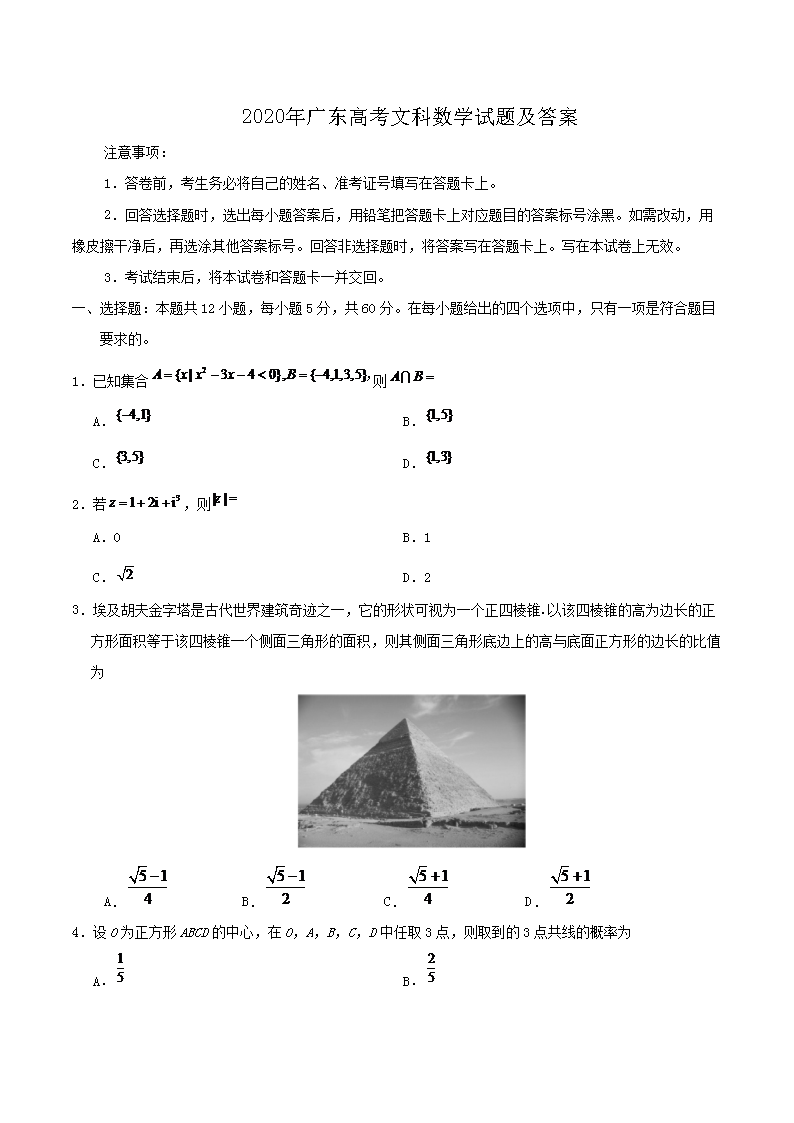 【文档名称】 2020年广东高考文科数学试题及答案(Word版).doc
