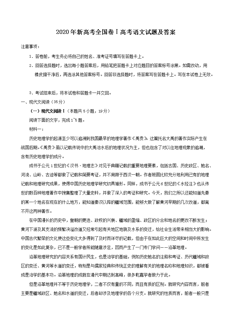 【文档名称】 2020年新高考全国卷Ⅰ高考语文试题及答案(Word版).doc