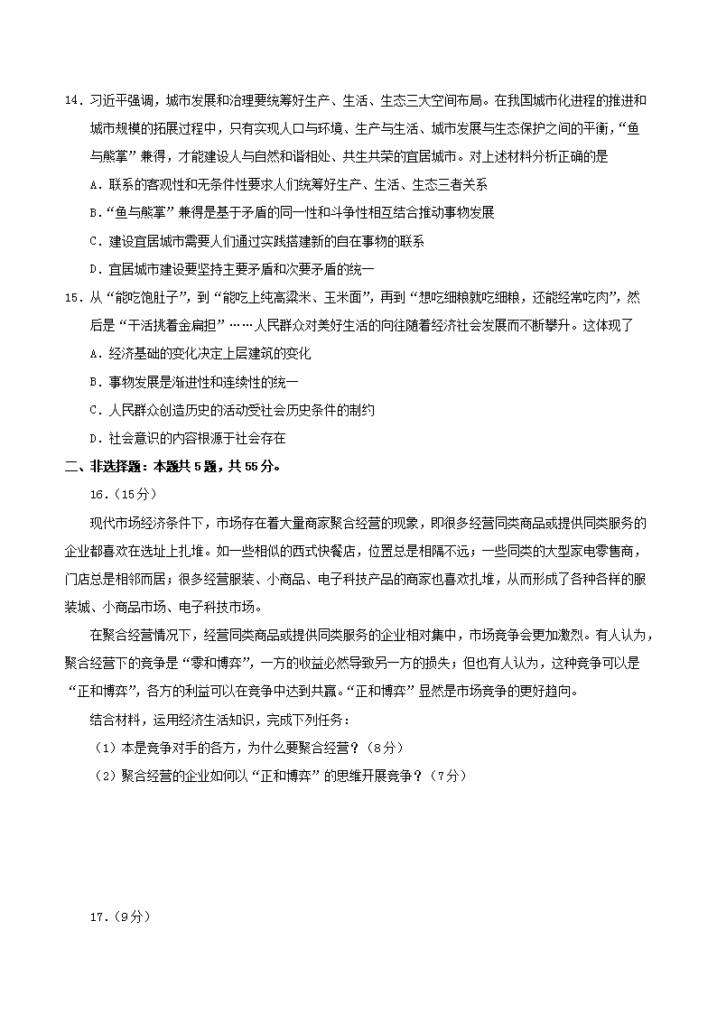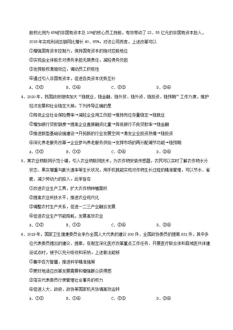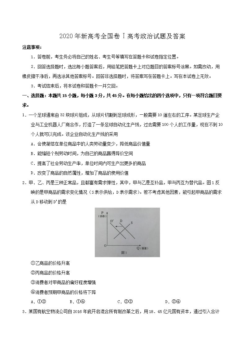 【文档名称】 2020年新高考全国卷Ⅰ高考政治试题及答案(Word版).doc