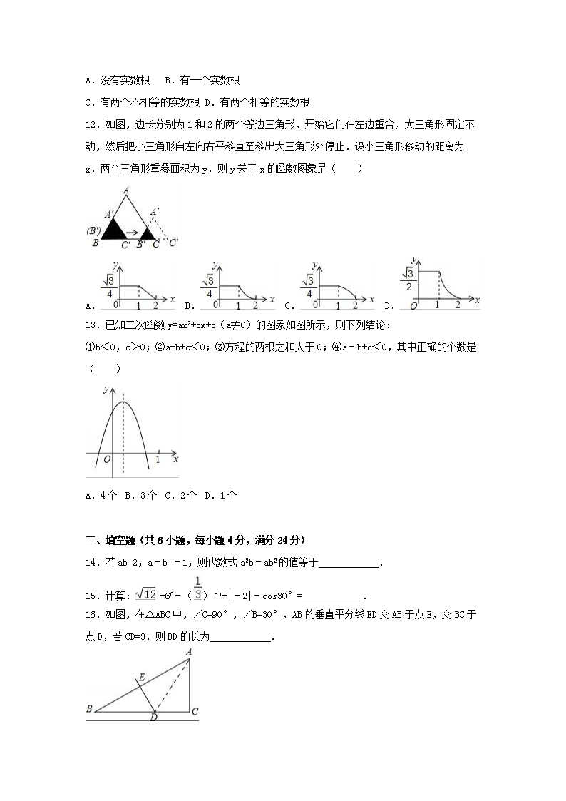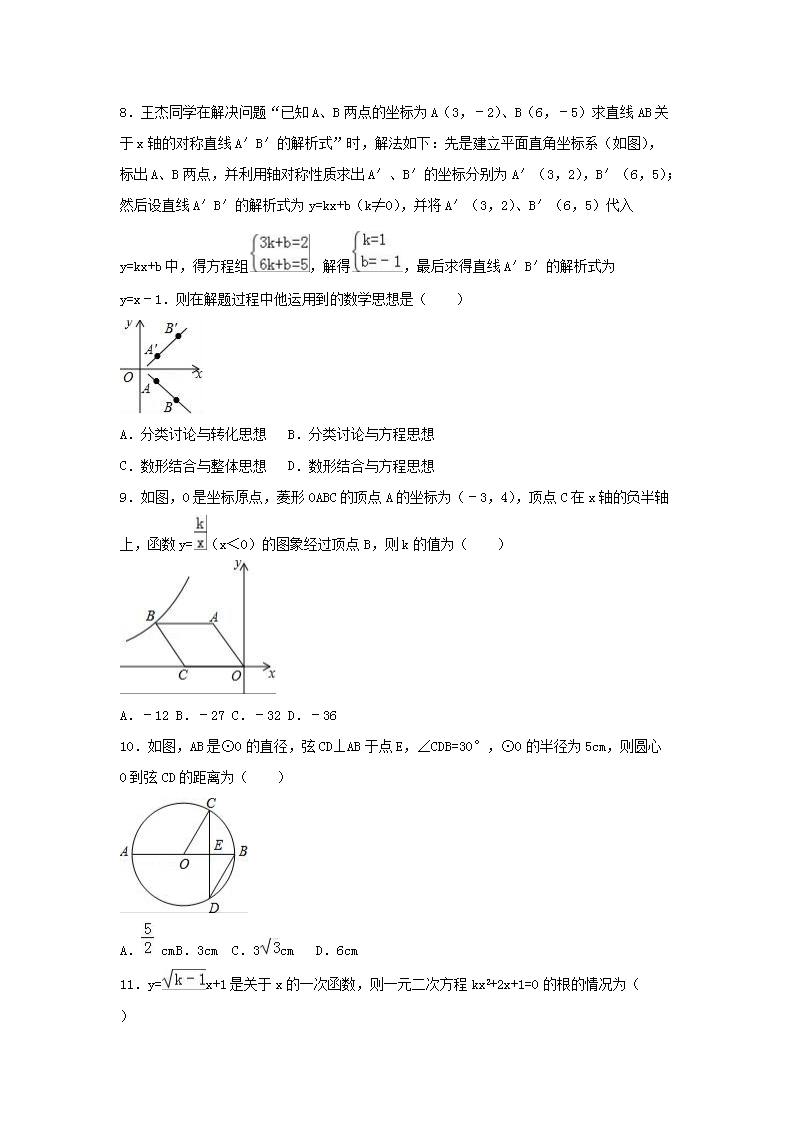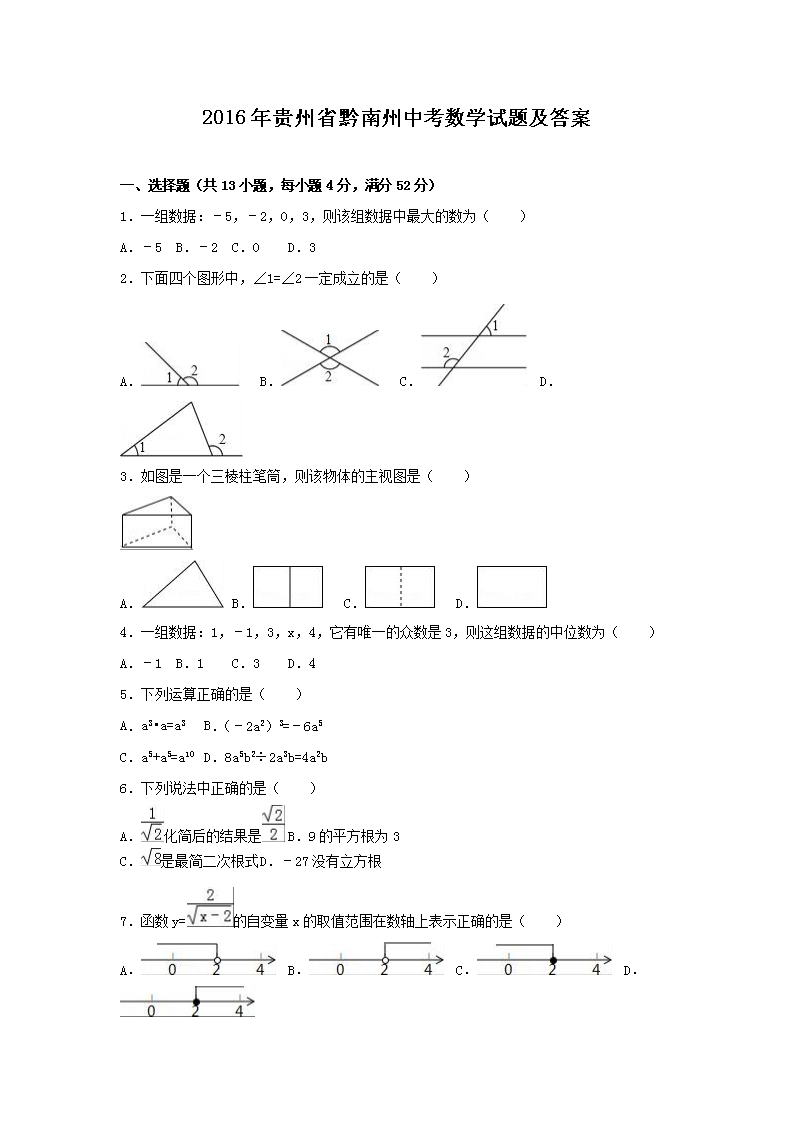【文档名称】 2016年贵州省黔南州中考数学试题及答案(Word版).doc