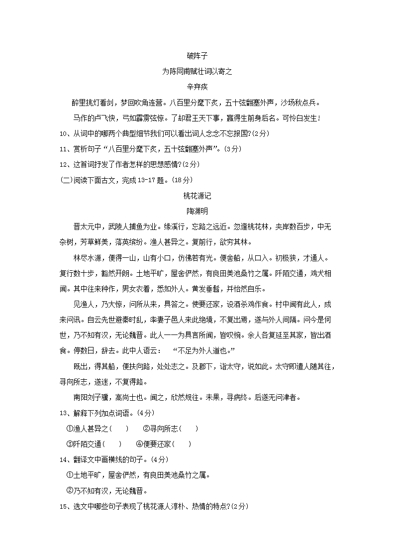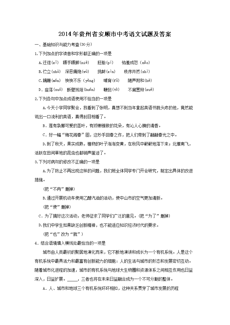 【文档名称】 2014年贵州省安顺市中考语文试题及答案(Word版).doc