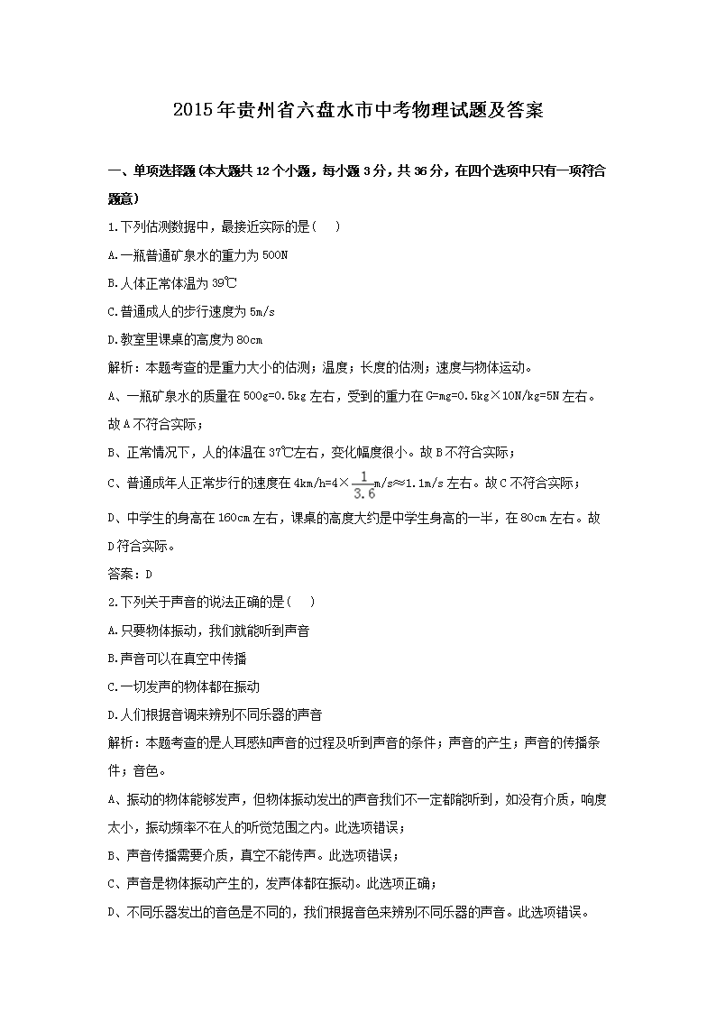 【文档名称】 2015年贵州省六盘水市中考物理试题及答案(Word版).doc