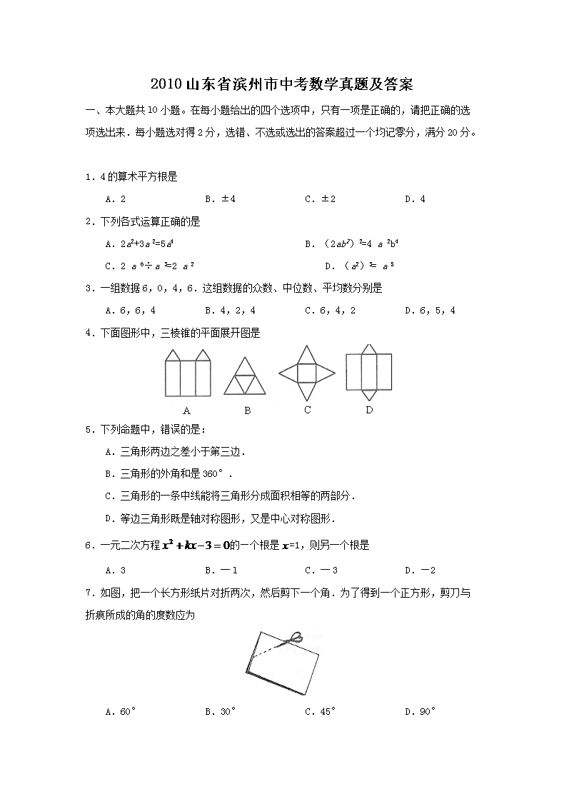 【文档名称】 2010山东省滨州市中考数学真题及答案(Word版).doc