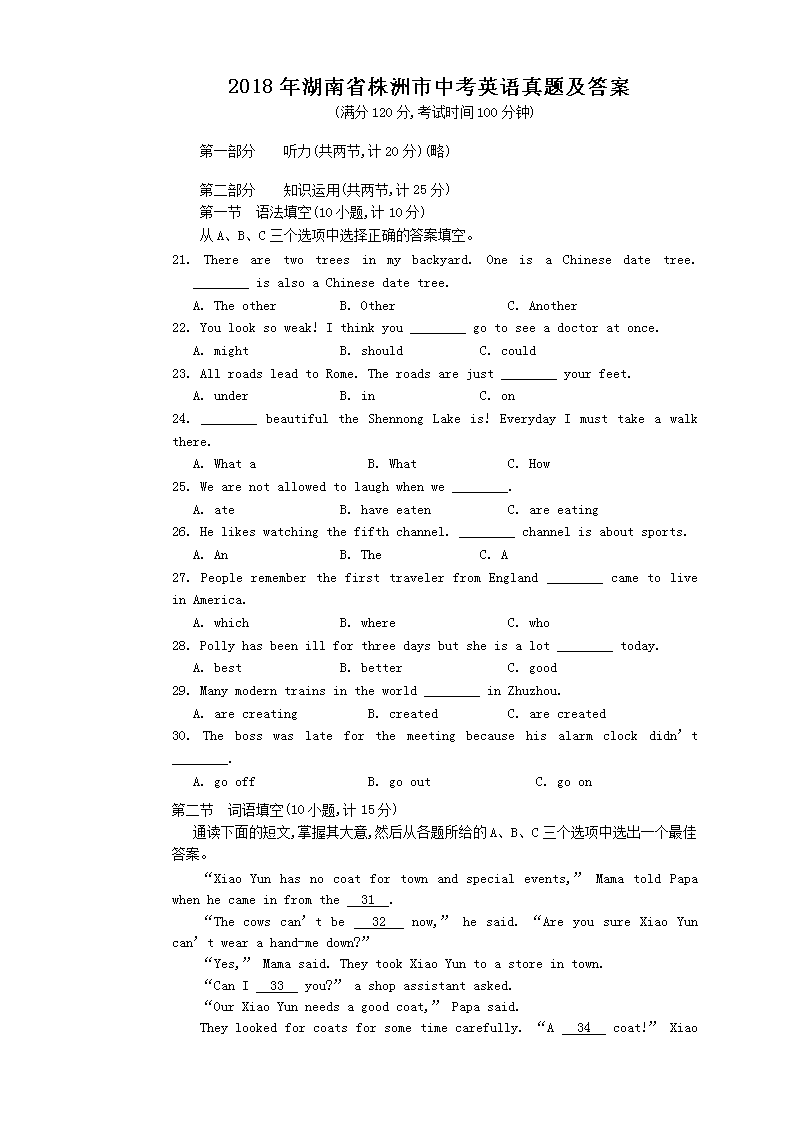 【文档预览】 无忧考网整理发布2018年湖南省株洲市中考英语真题及答案(Word版),前五页预览如下:
