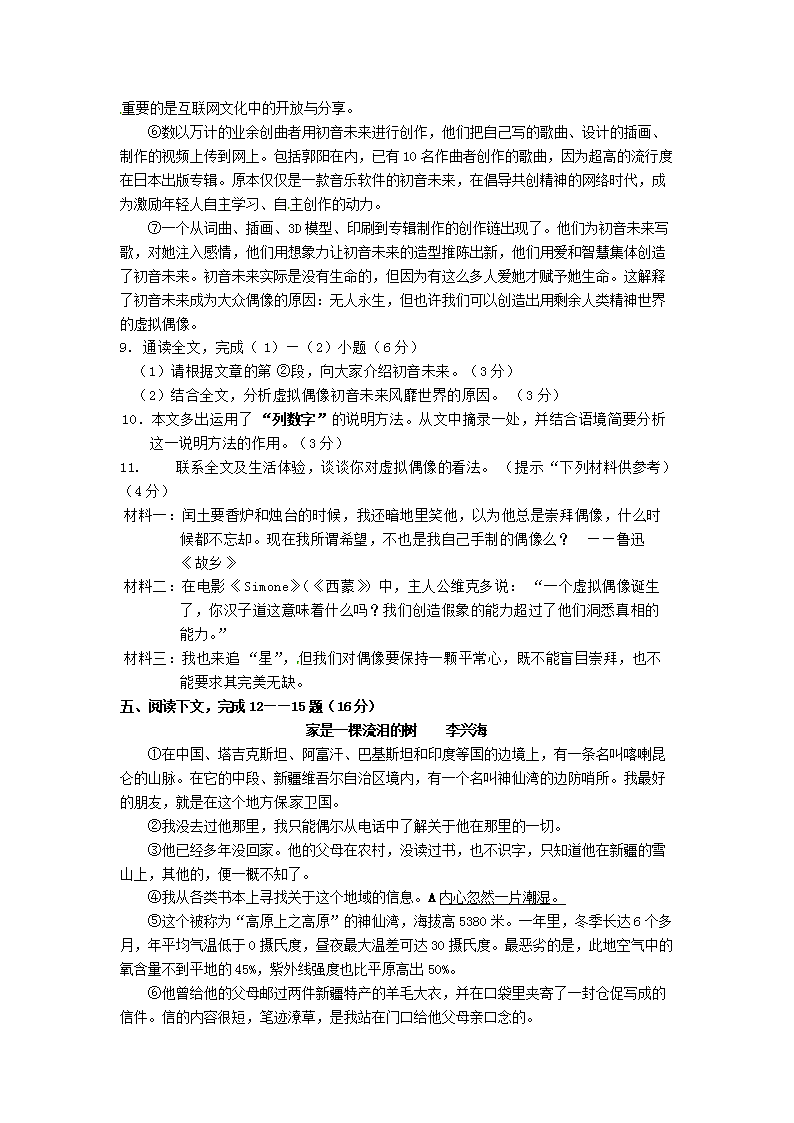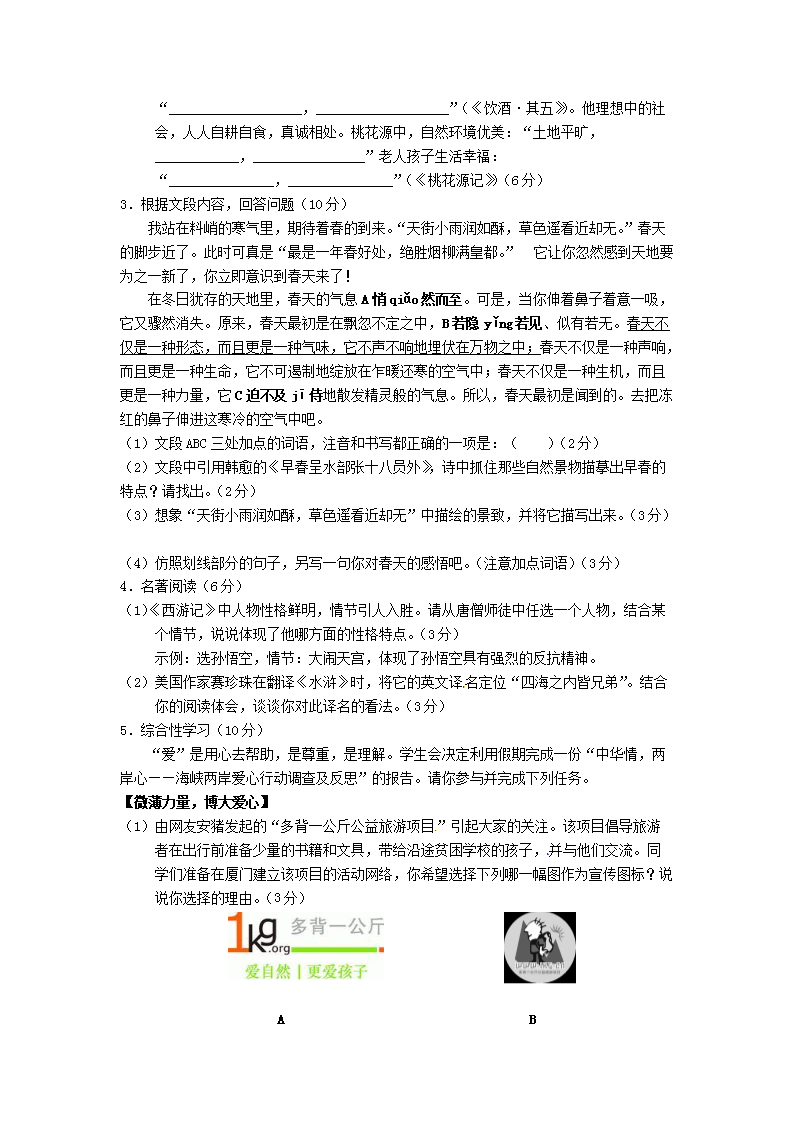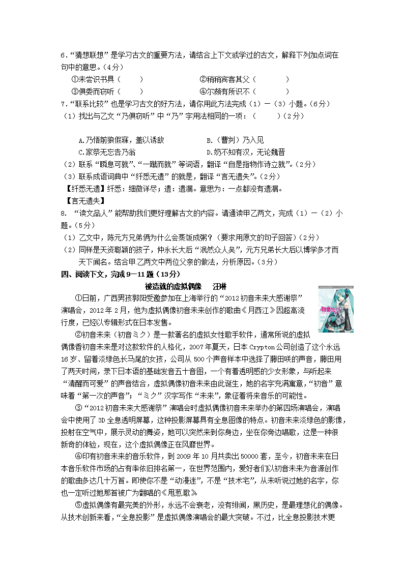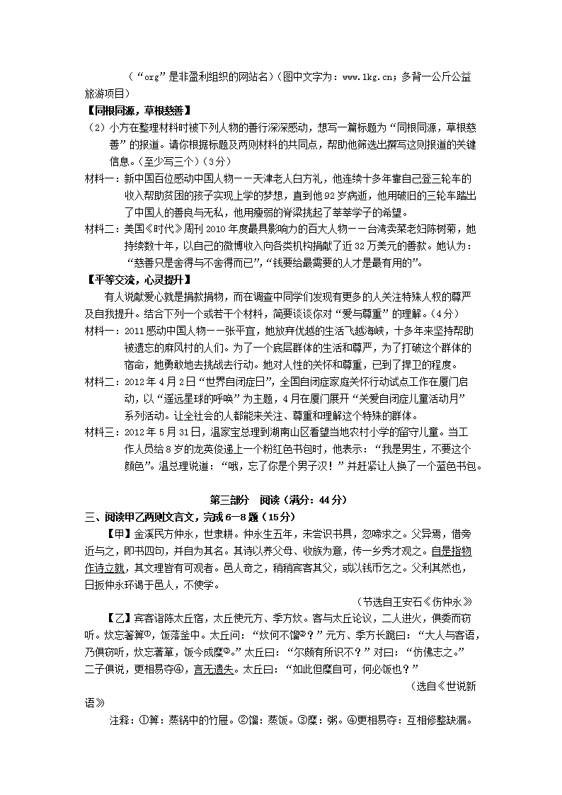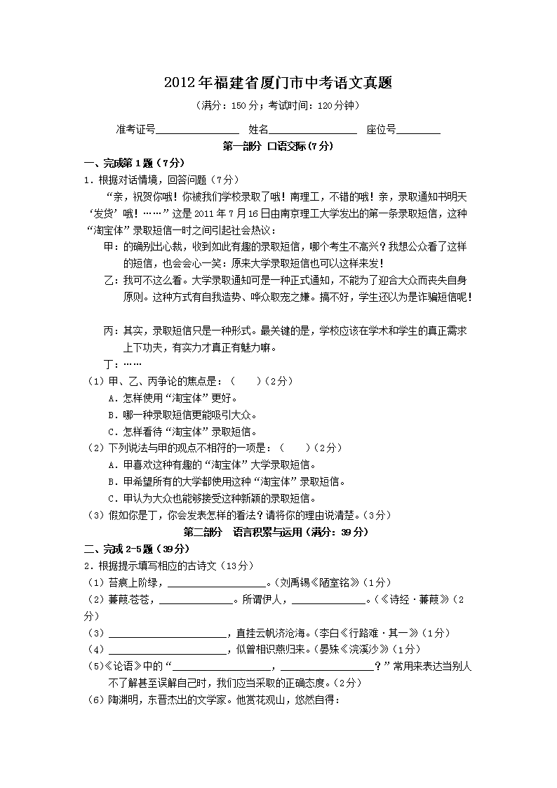 【文档预览】 无忧考网整理发布2012年福建省厦门市中考语文真题(Word版),前五页预览如下: