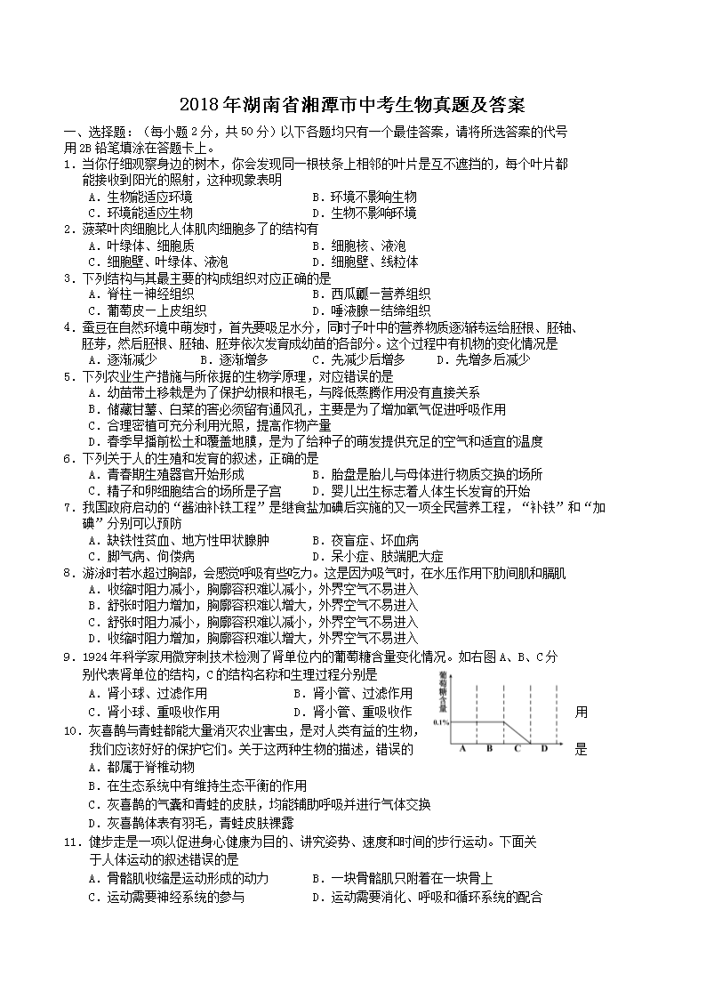 【文档预览】 无忧考网整理发布2018年湖南省湘潭市中考生物真题及答案(Word版),前五页预览如下: