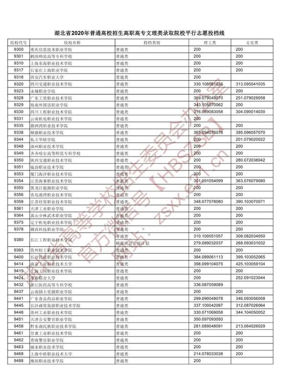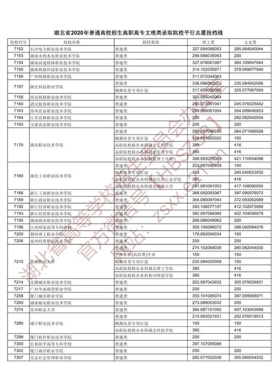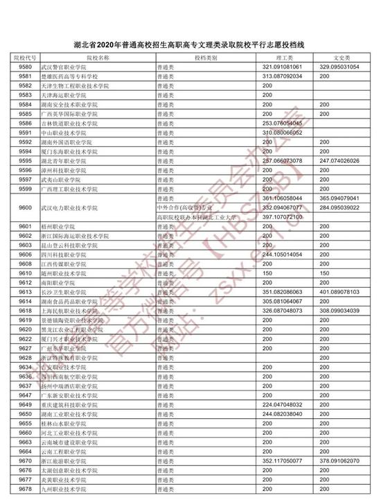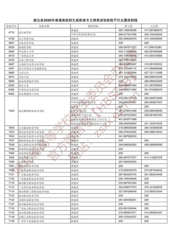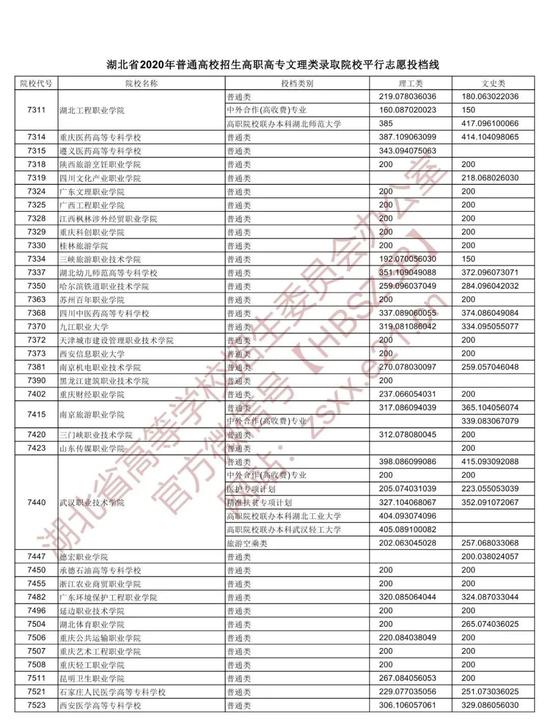 2020湖北高职高专文理类录取院校平行志愿投档线