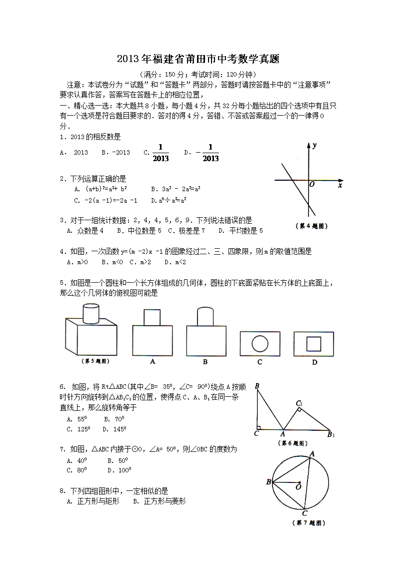 【文档名称】 2013年福建省莆田市中考数学真题(Word版).doc