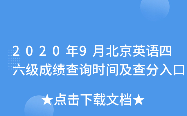 成绩发布:2020年9月北京英语四六级成绩将于2020年11月中下旬发布,具体发布的时间和方式以全国大学英语四、六级考试网站(cet.neea.edu.cn)发布的公告为准,准考证号是成绩查询的重要依据,请妥善保管。