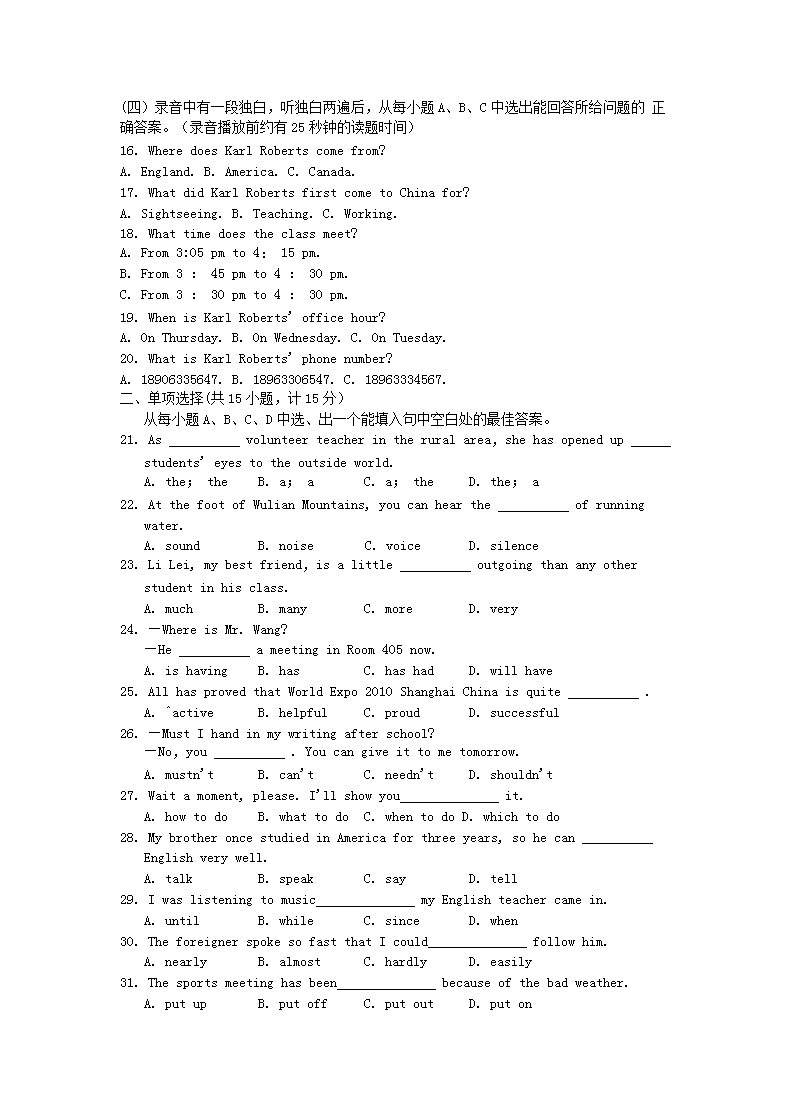 【文档预览】 无忧考网整理发布2010山东省日照市中考英语真题及答案(Word版),前五页预览如下: