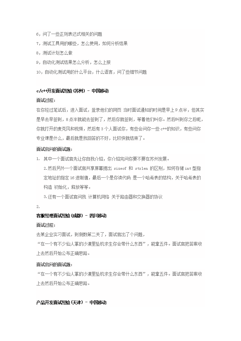 【文档名称】 中国移动公司招聘面试试题及面试过程(Word版).doc